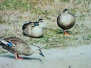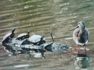 同じくカルガモさんと、亀さんです。にらみ合い?
