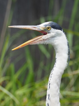 大きく くちばしを開いたアオサギ。