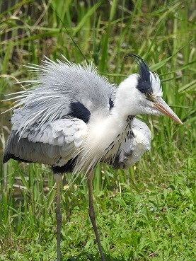 全身の羽毛を膨らませたアオサギ。