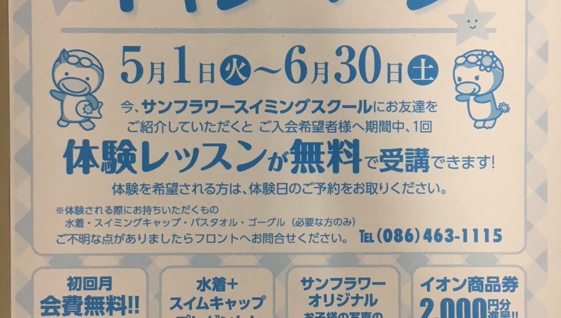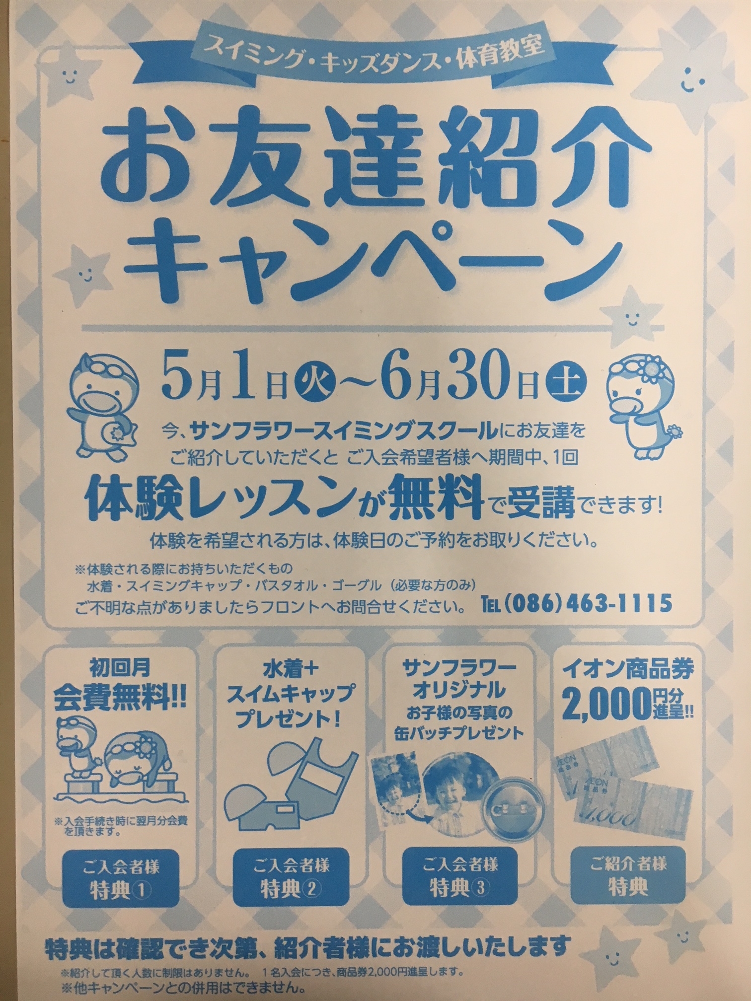 こんばんは! 別府です。 只今、キッズダンス・体育教室・スイミングでは お子様を対象に「お友達紹介キャンペーン」 を実施しております!! ○紹介者様の特典として・・・ 『イオン商品券2,000円分進呈』 ○入会希望者様の特典として・・・ 『体験後のご入会で、初回月会費無料』 お子様や、お孫さんでダンスや体育、スイミングに 興味がある方がいらっしゃいましたら、この機会に ご紹介下さい♪