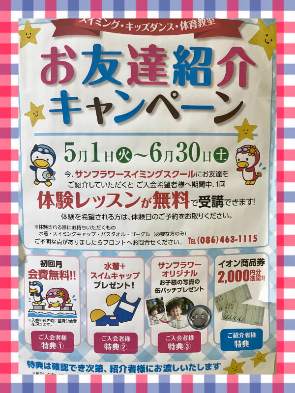 今月は、スイミングスクールのお友達紹介キャンペーンがあったり、