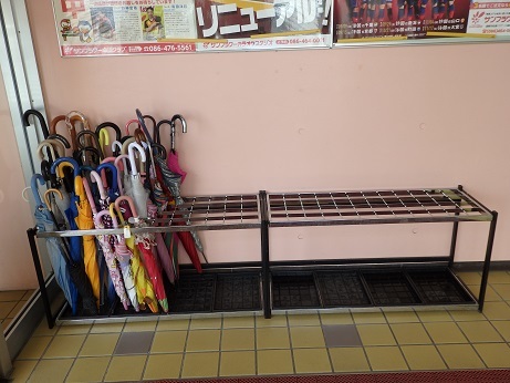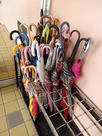 入り口にある傘立てに、忘れられた傘が並んでいます。