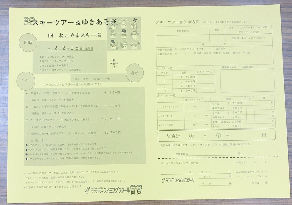 早速ですがスイミングスクールでスキーツアーの申し込みがスタートしております!