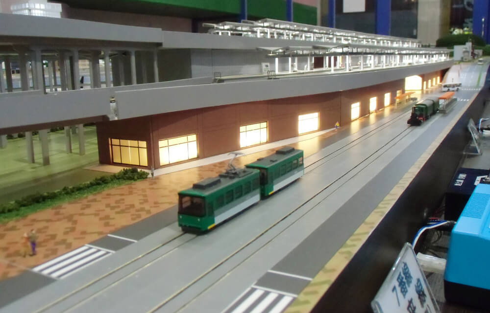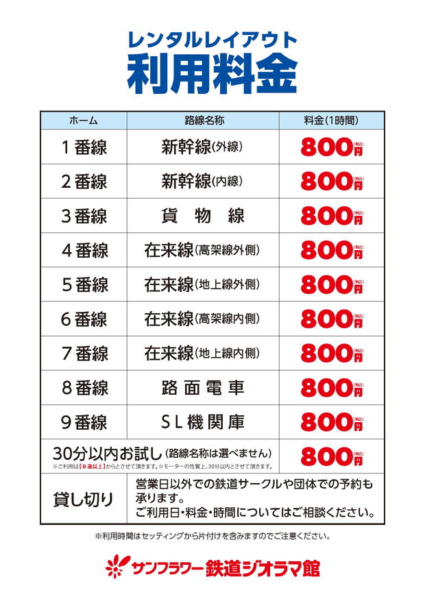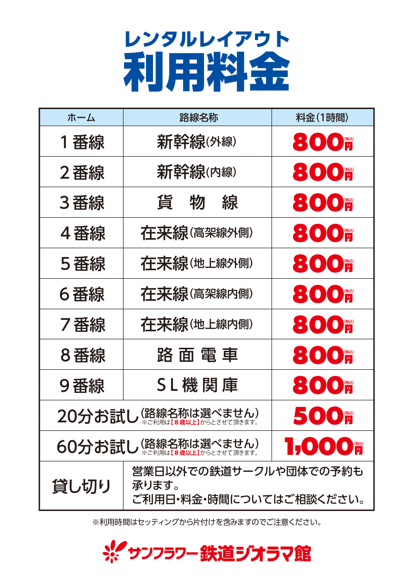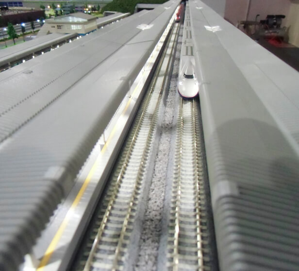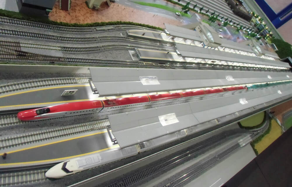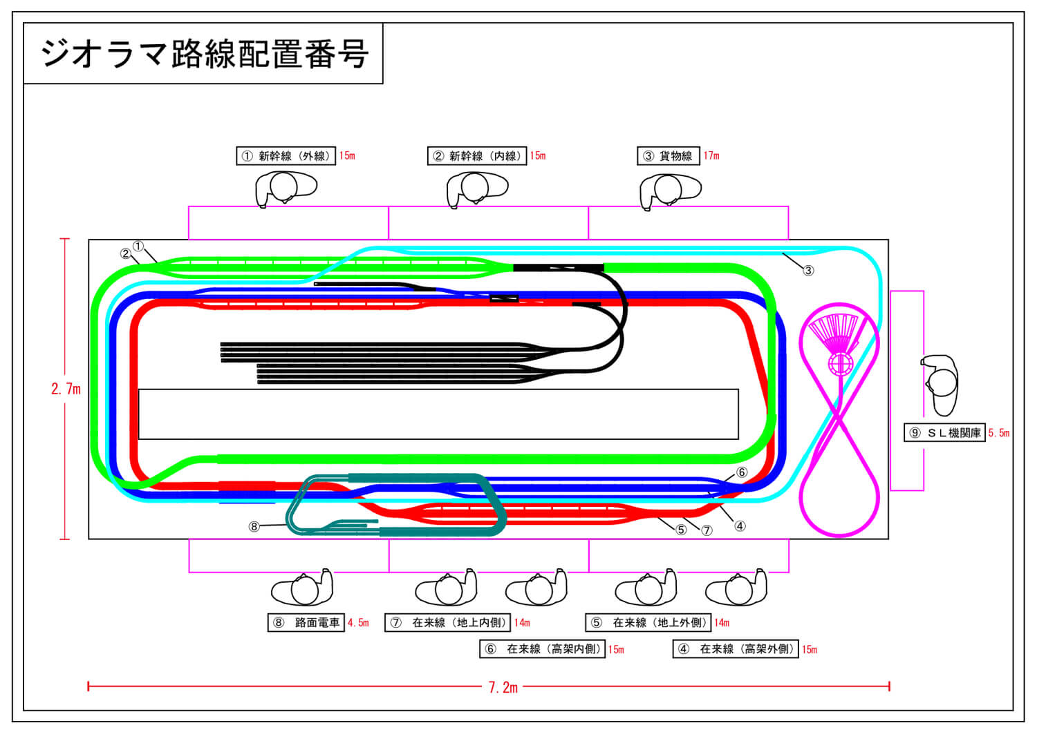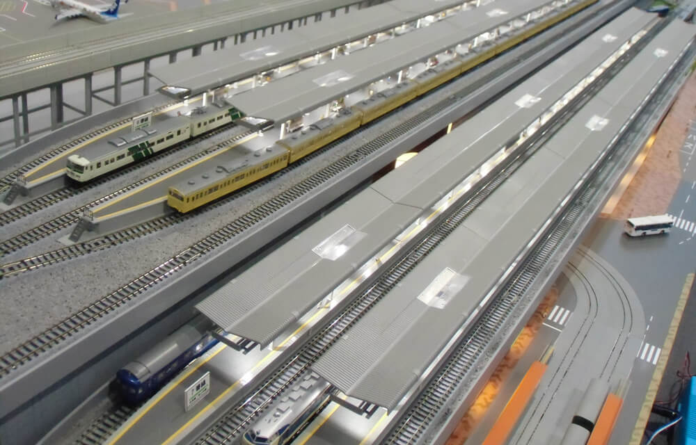 新幹線(外線、内線)2本、在来線(高架線外側・内側)2本、在来線(地上線外側・内側)2本、貨物線1本、路面電車2本、SL機関庫1本の計10本の充実した線路を準備しております。
