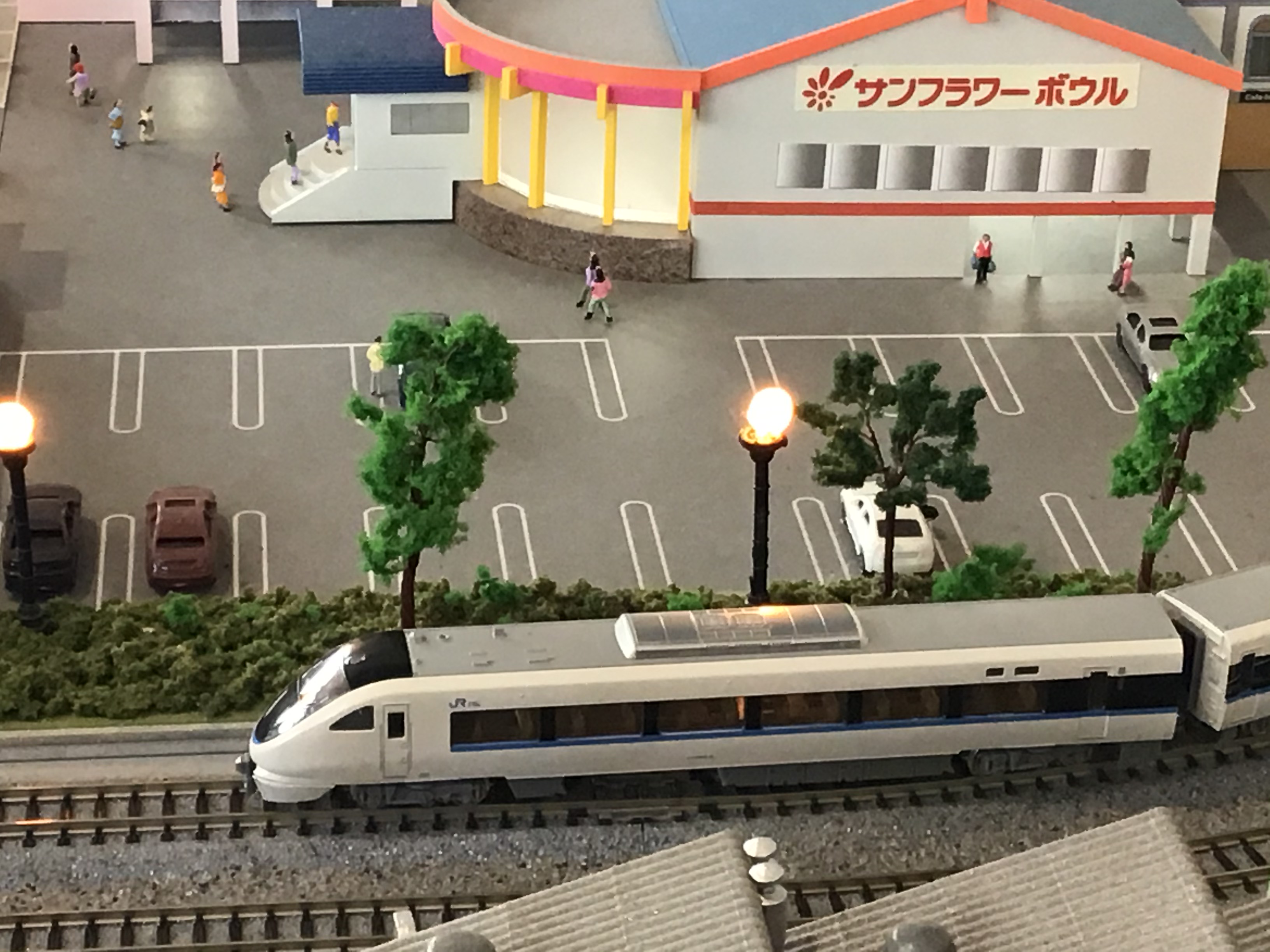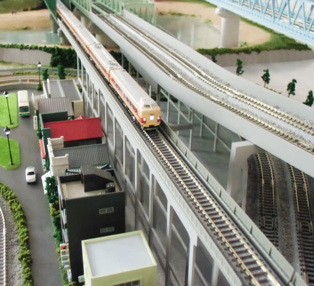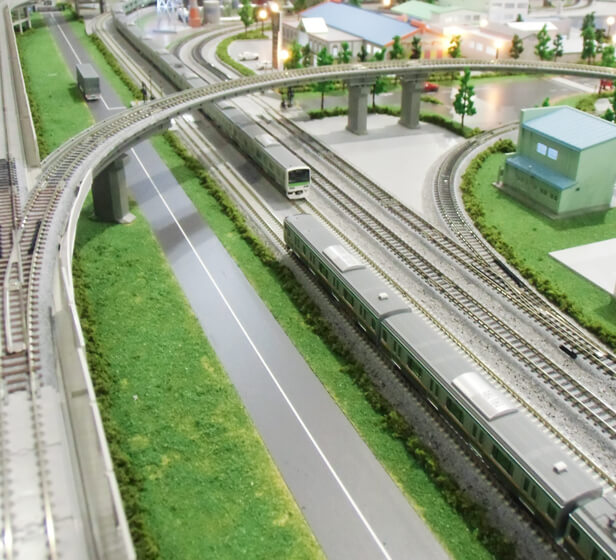 町並みや自然の風景の中で自慢のNゲージ車両を走らせることができます。