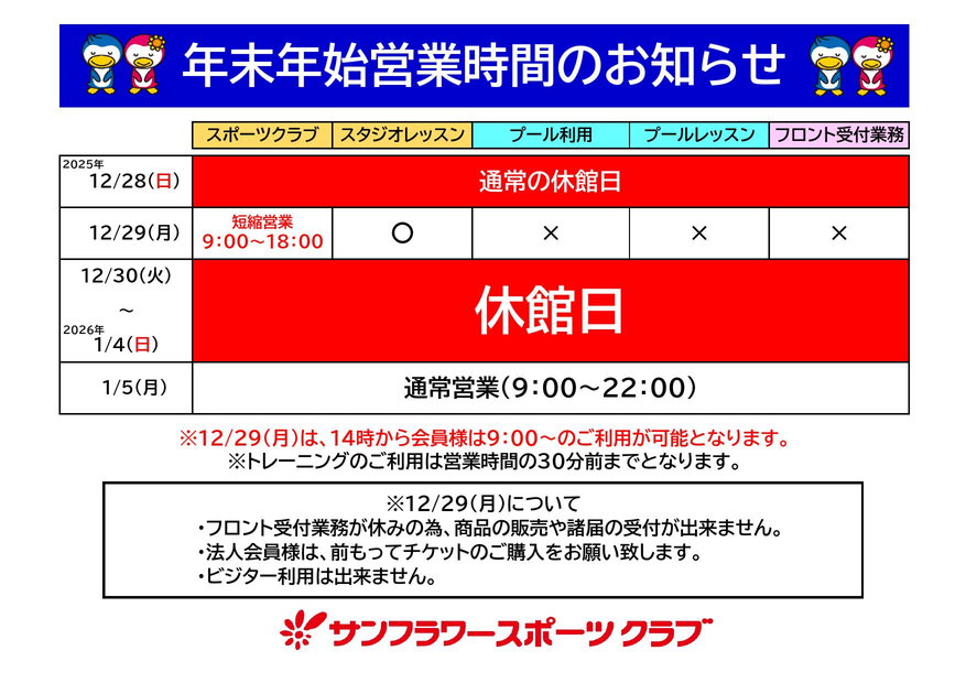※トレーニング施設のご利用は、閉館時間の30分前までとなります。
