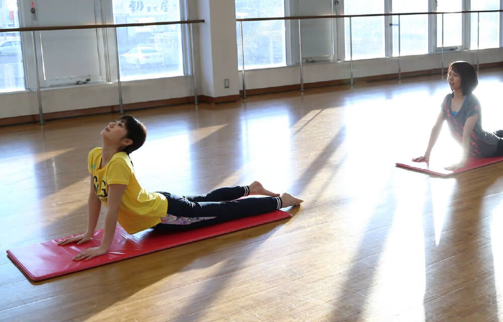 マットの上でゆっくりと体をほぐし、筋肉を柔軟にしていきます。