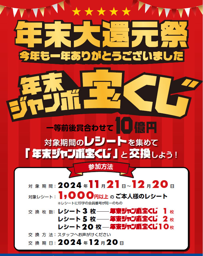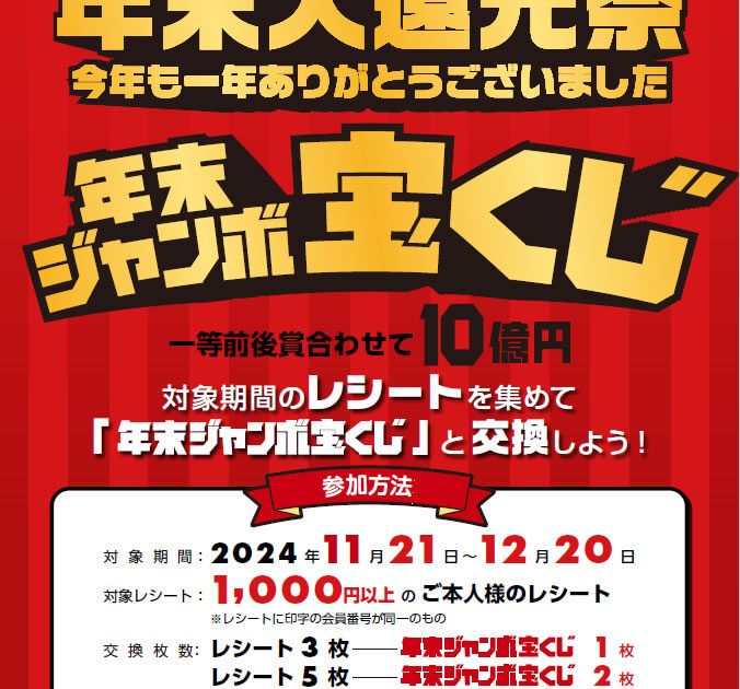 1,000円以上のレシートを集めれば「年末ジャンボ宝くじ」と交換できます。