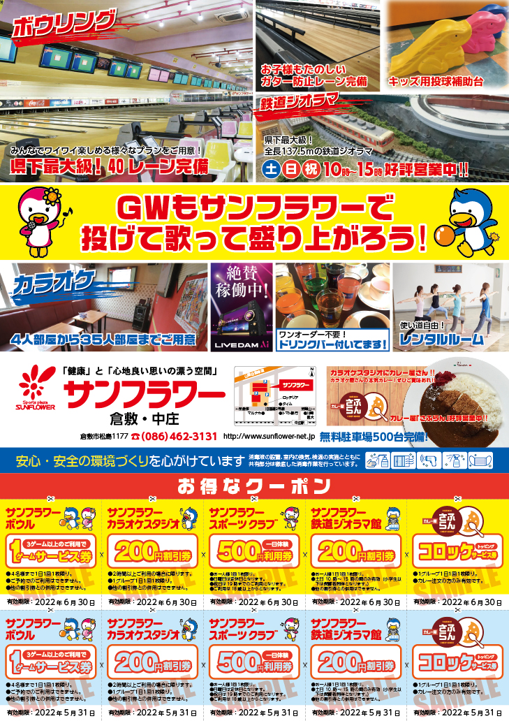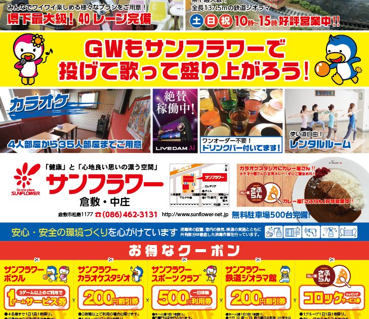 サンフラワーは岡山県倉敷市にあるボウリング・カラオケ・フィットネス・スイミングが楽しめる複合施設です。無料駐車場500台完備!