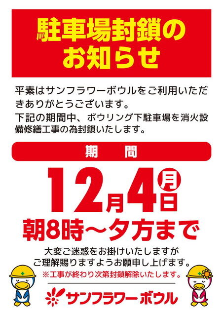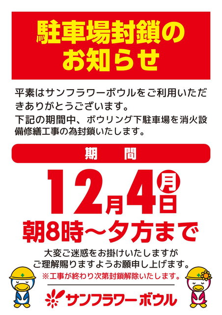 下記の期間中、消火設備修繕の為にボウリング場下駐車場を閉鎖致します。
