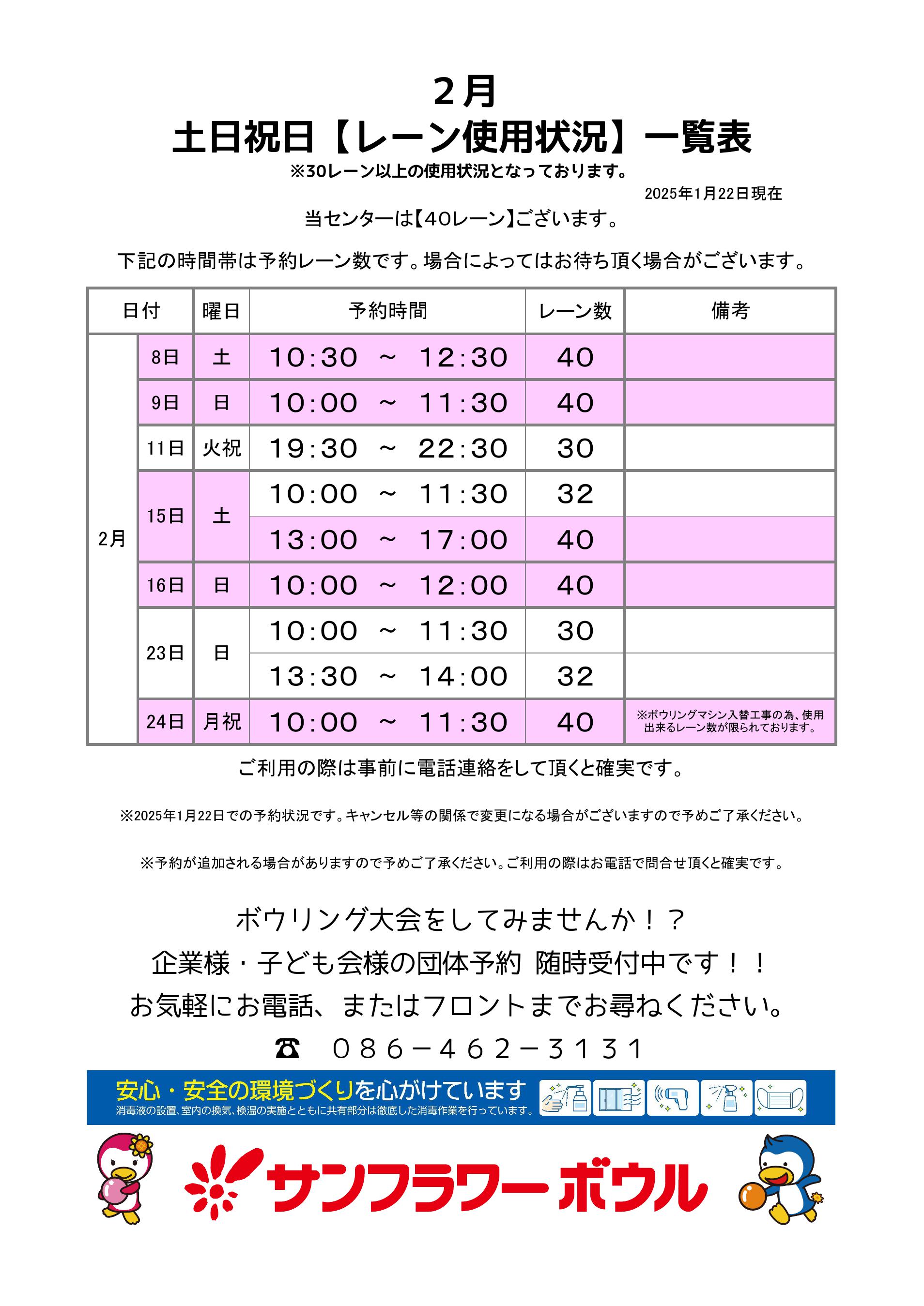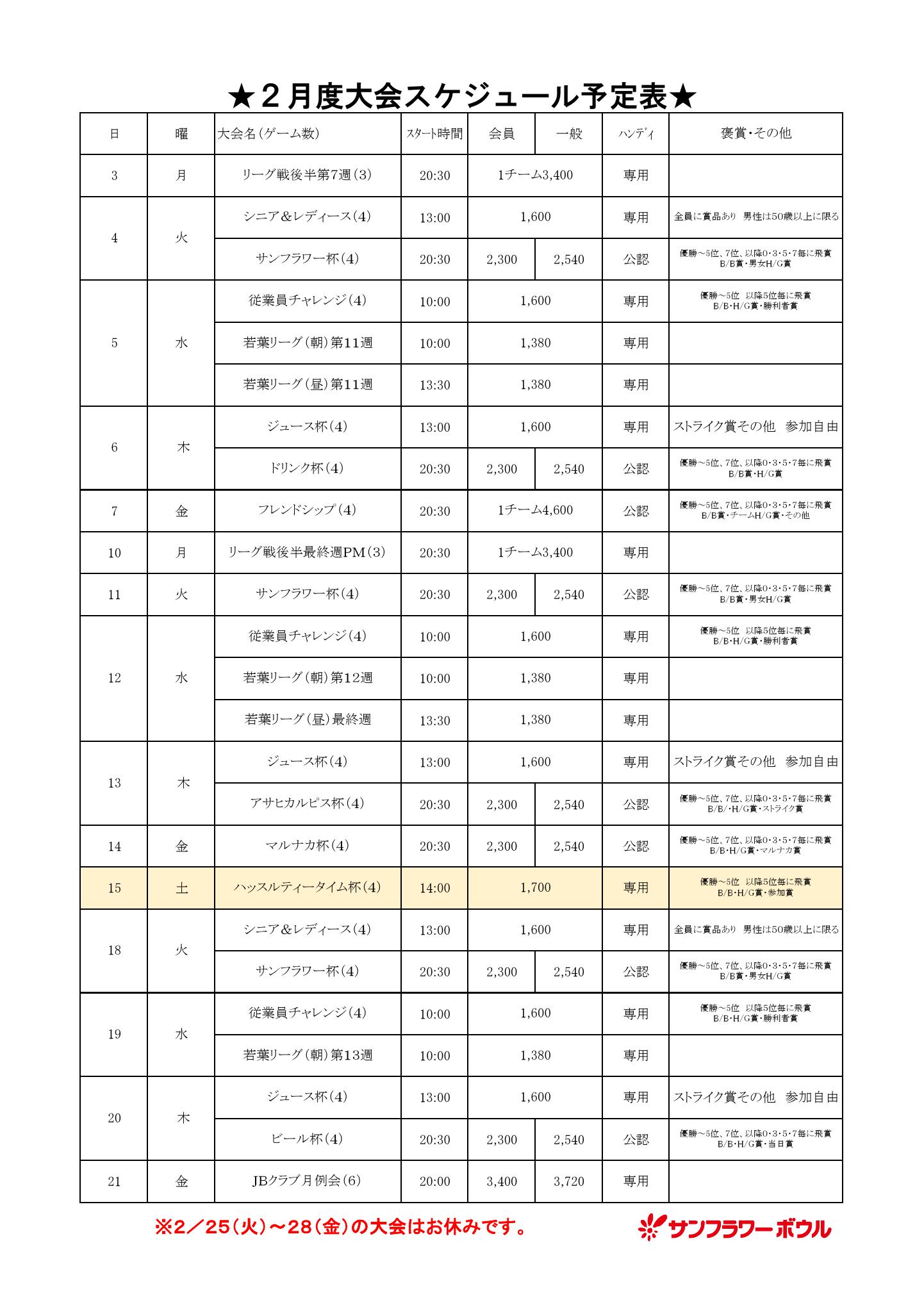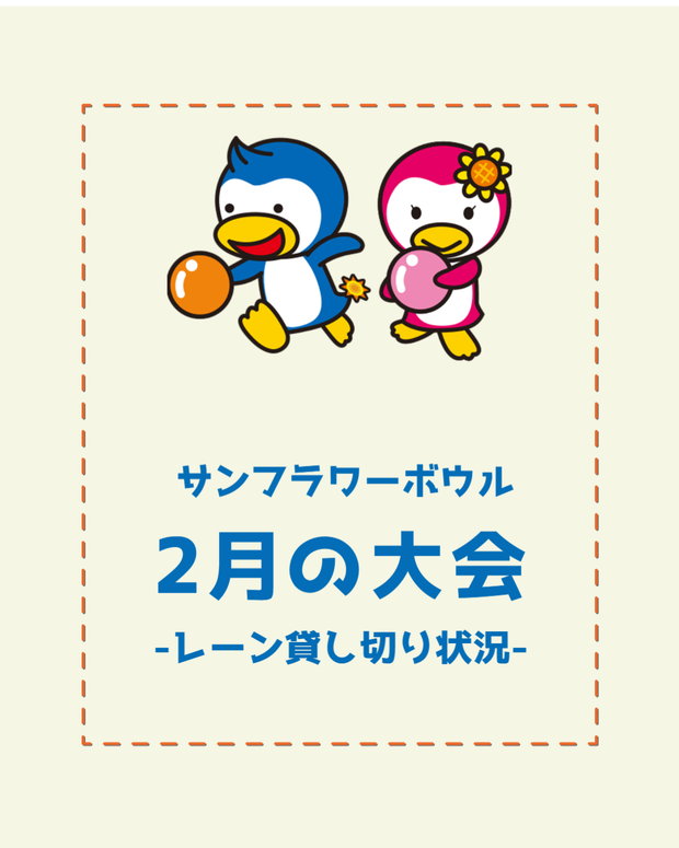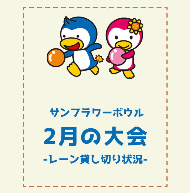 サンフラーボウルの2025年2月度の大会、レーン貸し切り状況一覧です。