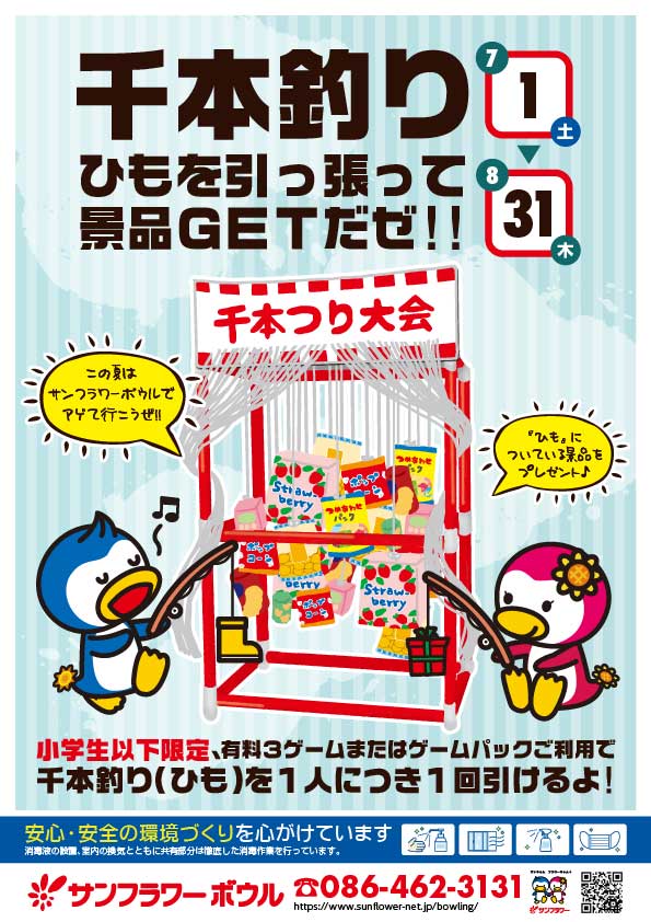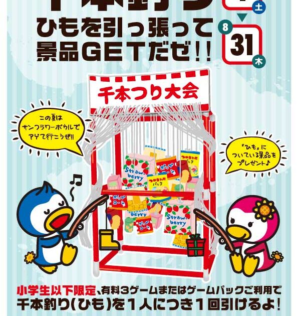 小学生以下限定で、有料3ゲームまたはゲームパックのご利用で、千本つり(ひも)に1人につき1回引けるよ!!
