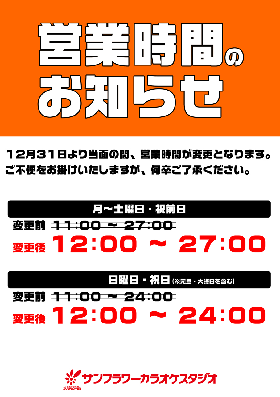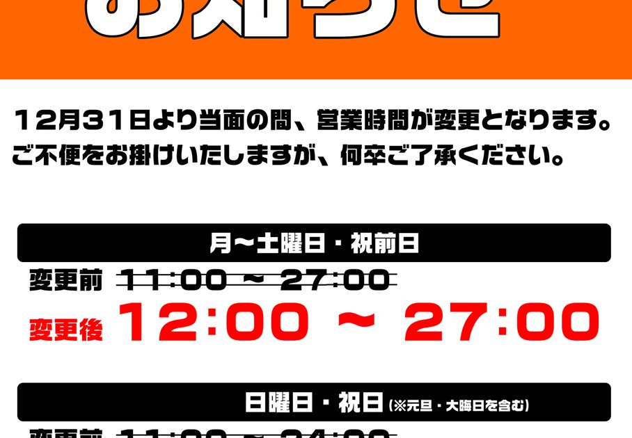 この度新型コロナウィルスの感染予防策の一環として、12/31より営業時間を変更させて頂くこととなりました。