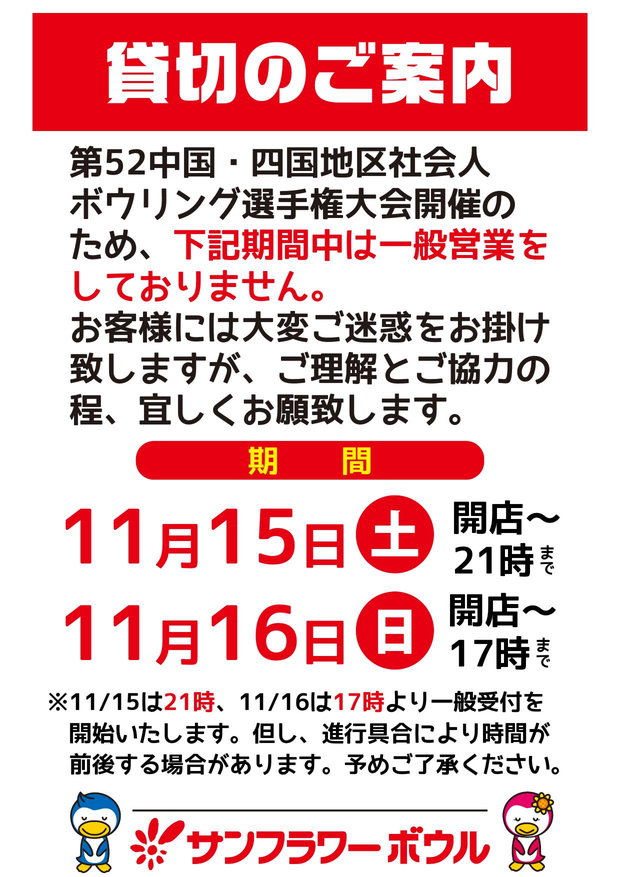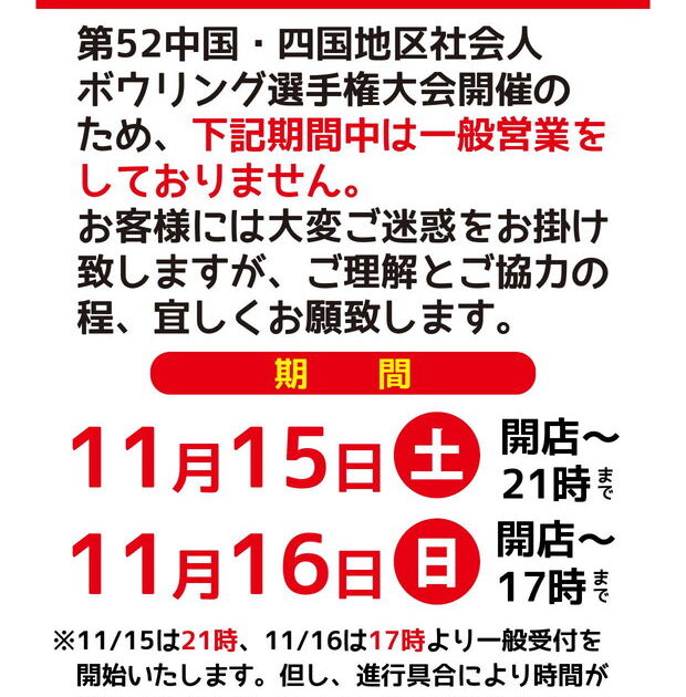 第52回 中国・四国地区社会人ボウリング選手権大会開催のため、下記期間中は一般営業をしておりません。