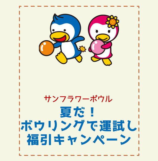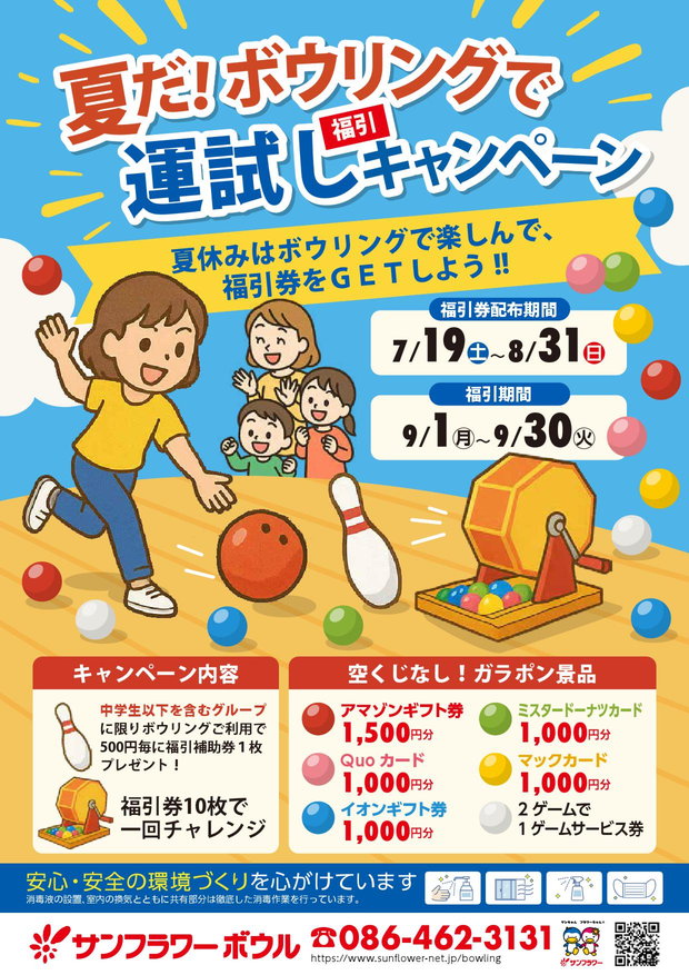 サンフラワーボウルでは、「夏だ!ボウリングで運試し福引キャンペーン」と銘打って、福引のイベントを実施しております!