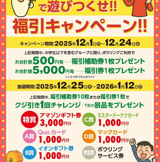 中学生以下を含むグループに限り、ボウリングご利用で500円毎に福引補助券1枚プレゼント!