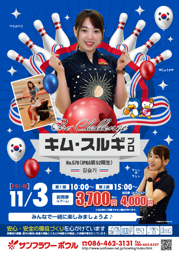 サンフラワーボウルでは、来る11月3日(金・祝)にPリーグ出場選手で唯一の外国選手 複数の優勝経験をお持ちのキム・スルギ選手をお招きし、プロチャレンジマッチを開催致します。