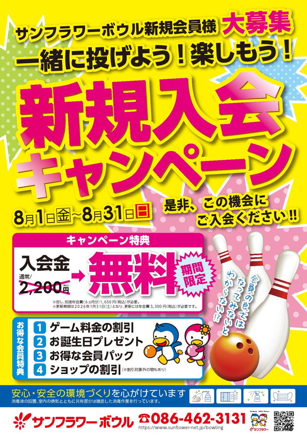 サンフラワーボウルでは、加入いただくと料金がお得になったり、様々な特典が受けれる会員様を募集中です!