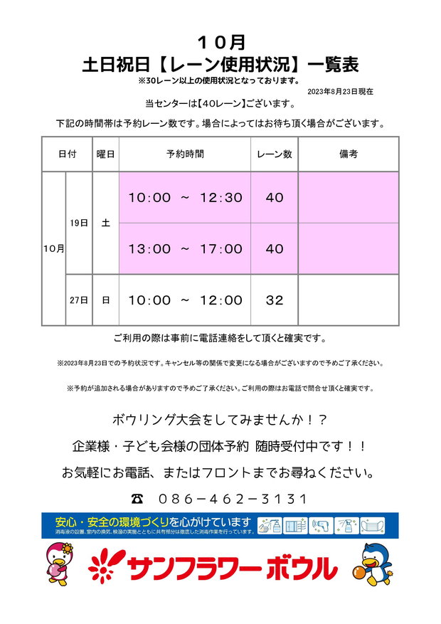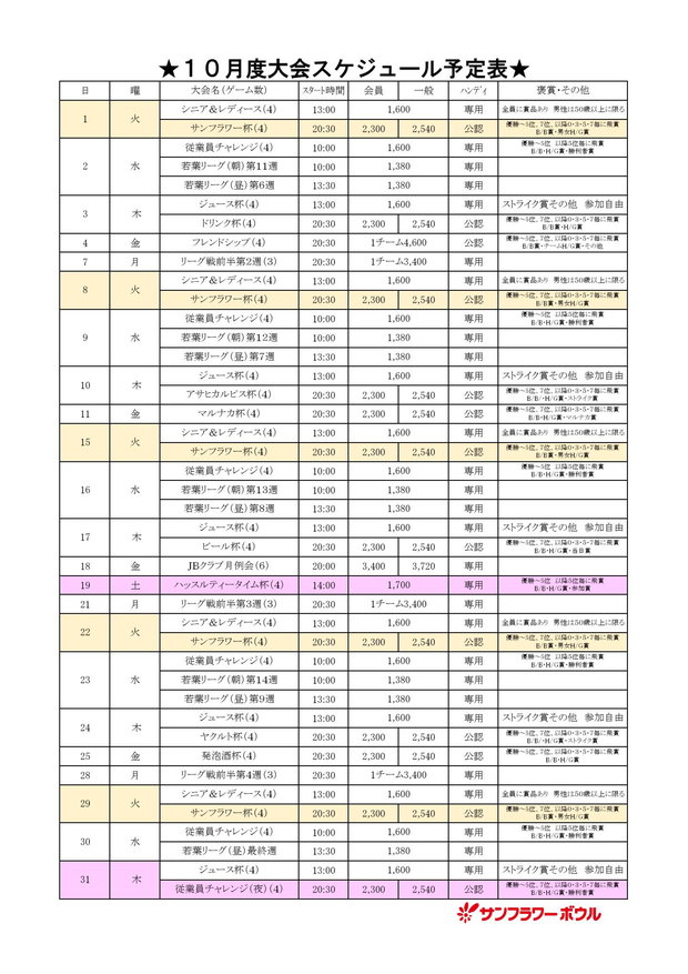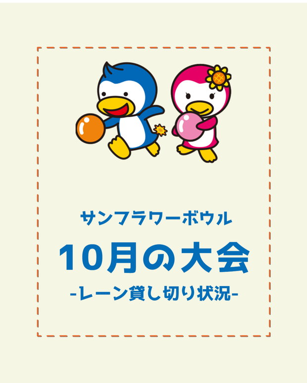 サンフラーボウルの2024年10月度の大会、レーン貸し切り状況一覧です。