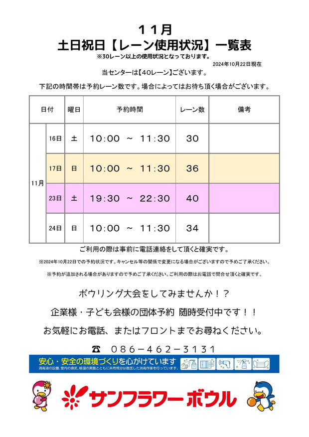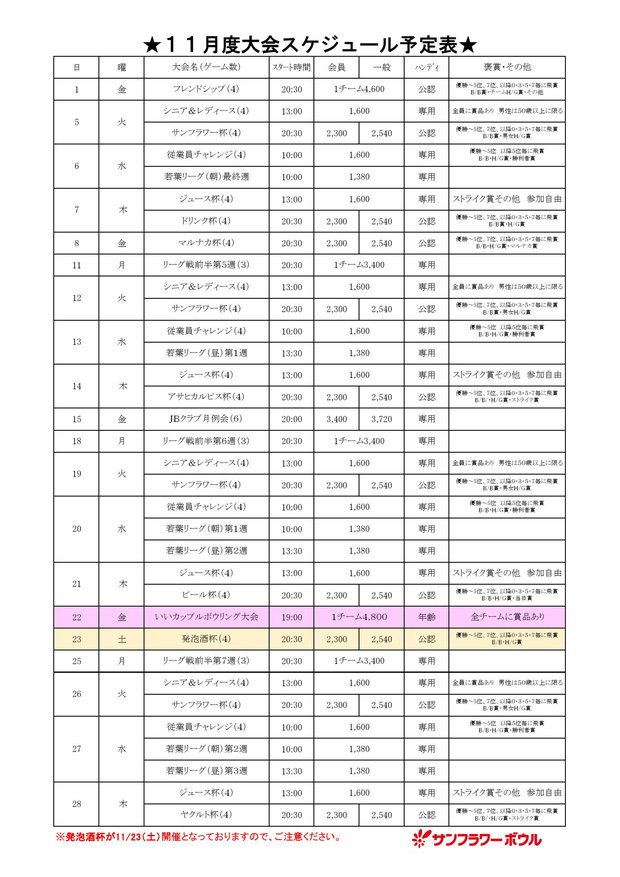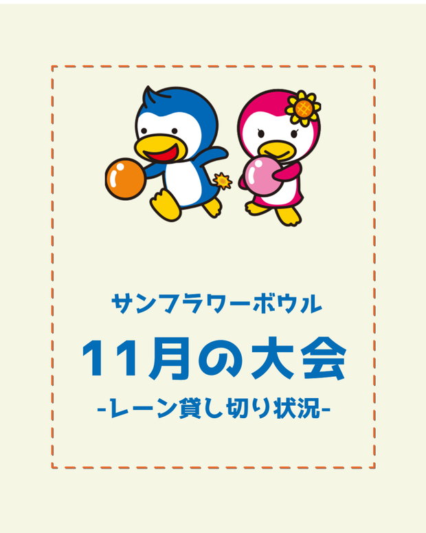 サンフラーボウルの2024年11月度の大会、レーン貸し切り状況一覧です。