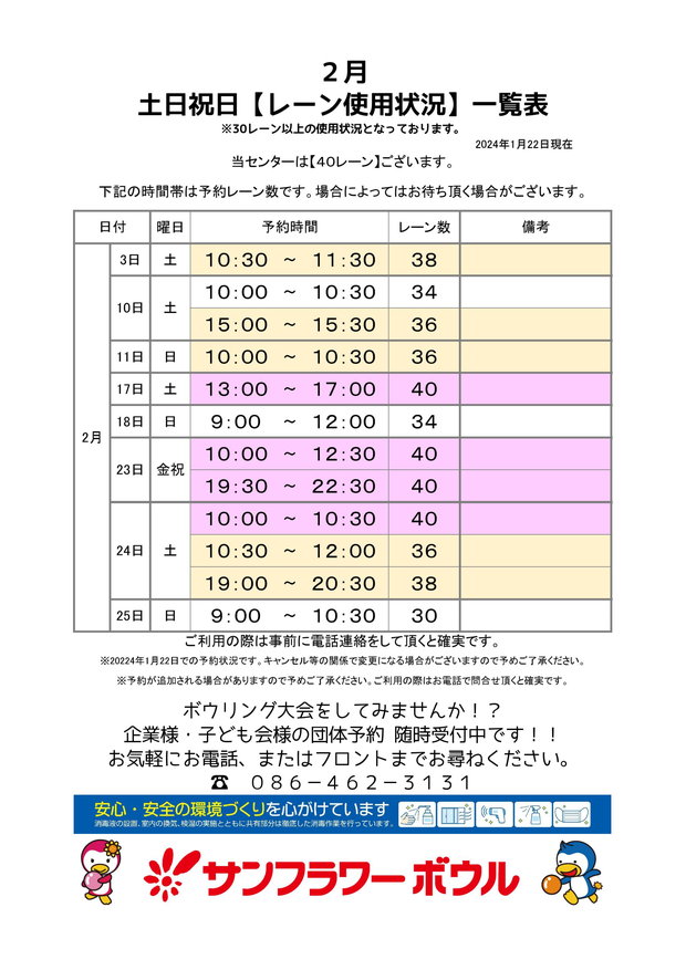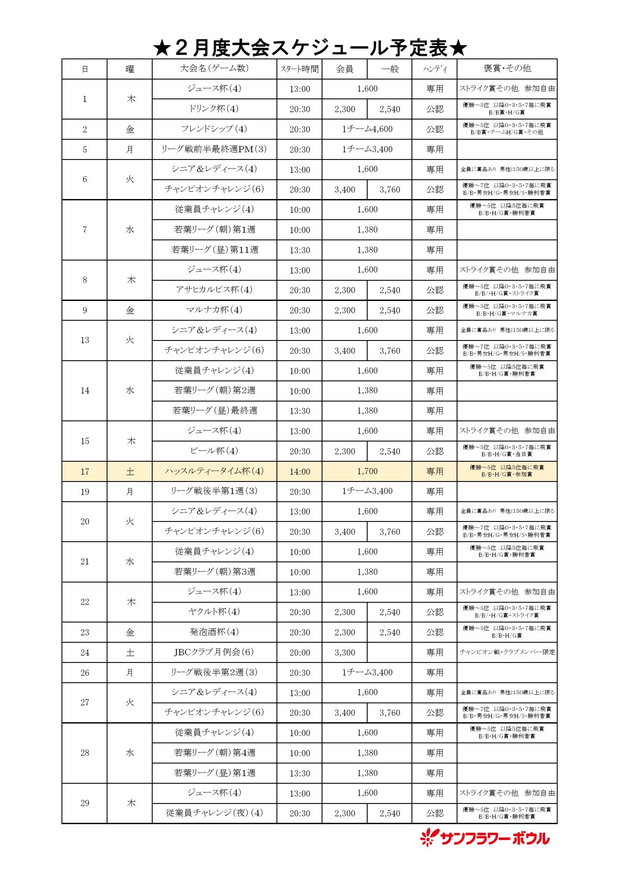 サンフラーボウルの2024年2月度の大会、レーン貸し切り状況一覧です。