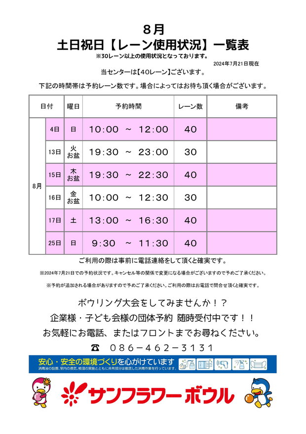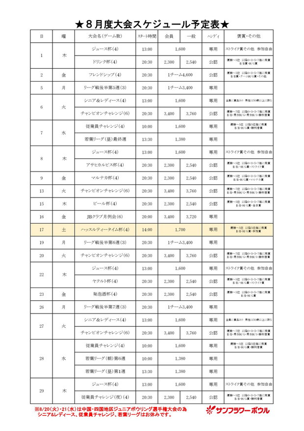 サンフラーボウルの2024年8月度の大会、レーン貸し切り状況一覧です。