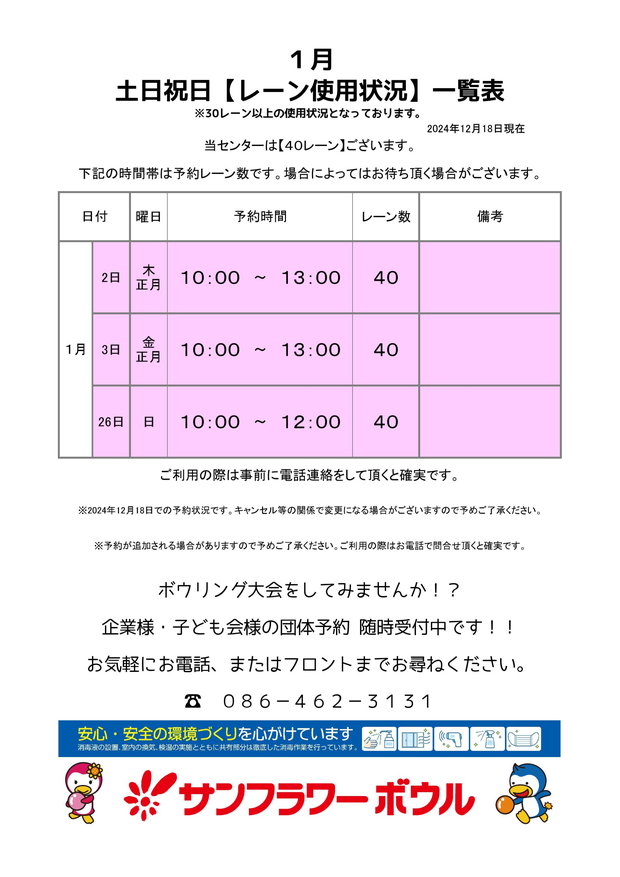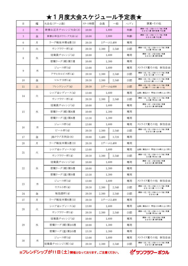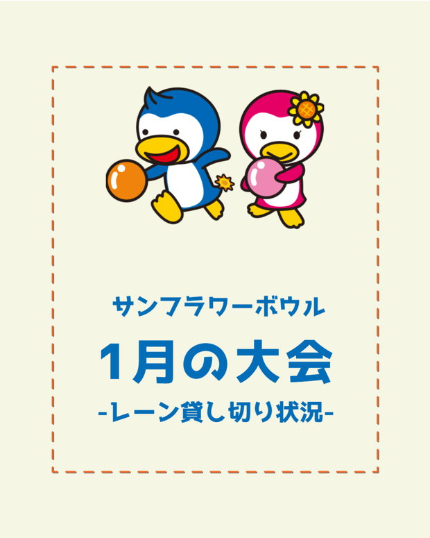 サンフラーボウルの2025年1月度の大会、レーン貸し切り状況一覧です。