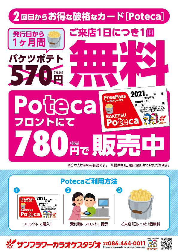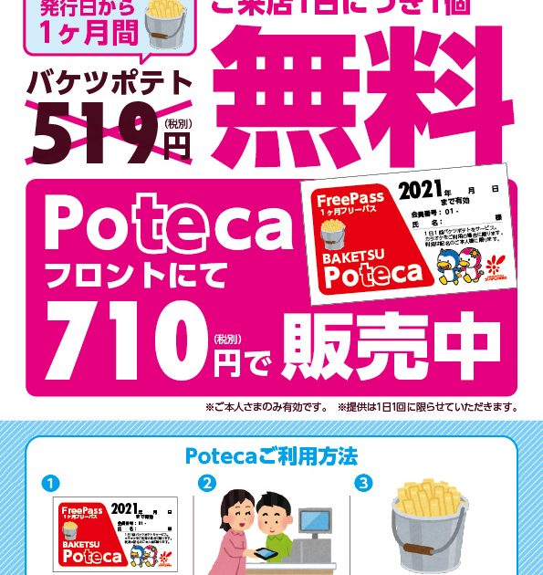 710円(税別)で1ヶ月有効のバスを買うと、来店の度にバケツポテトが貰えます!