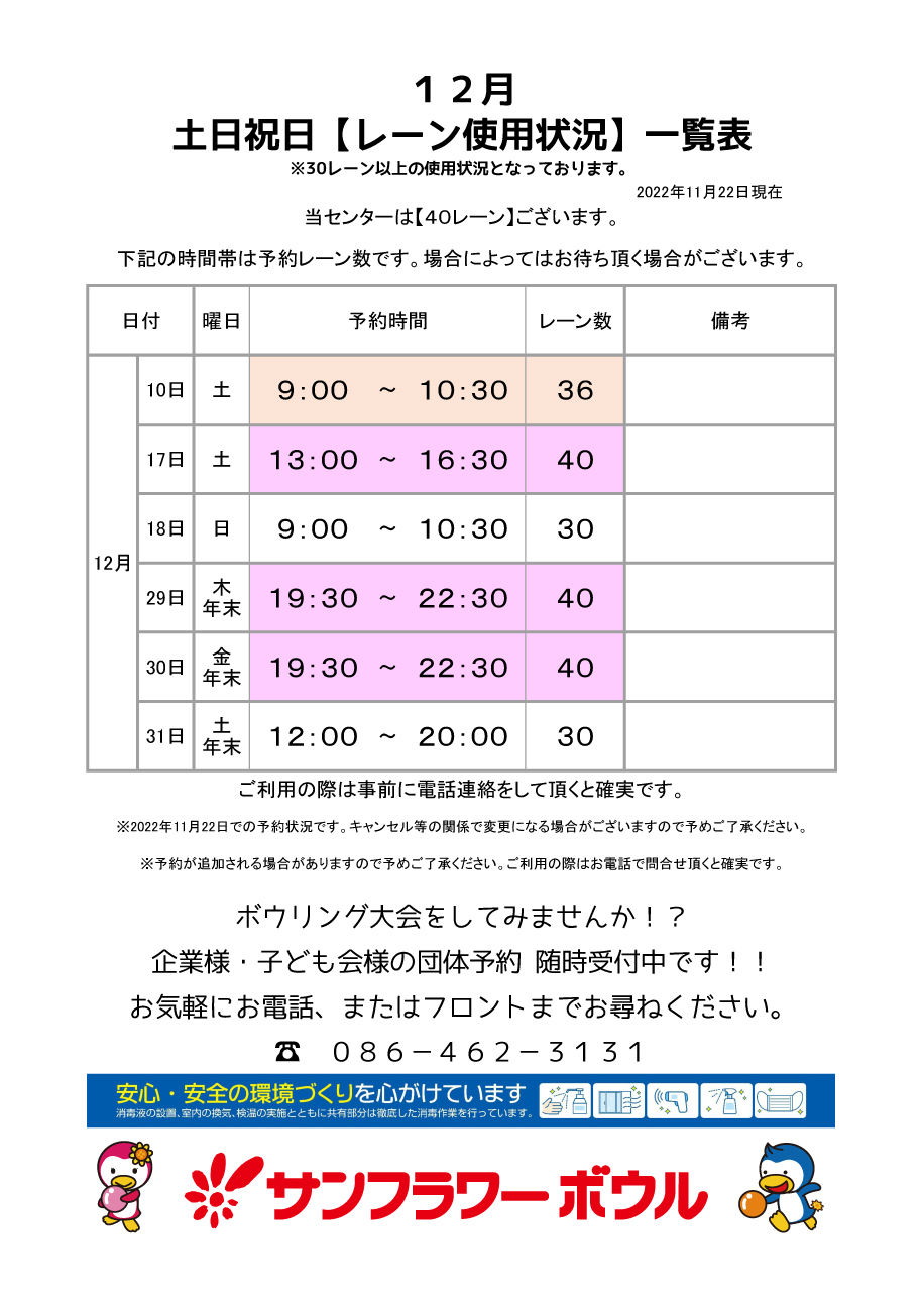 2022年12月中の土日祝日のレーン使用状況の一覧表