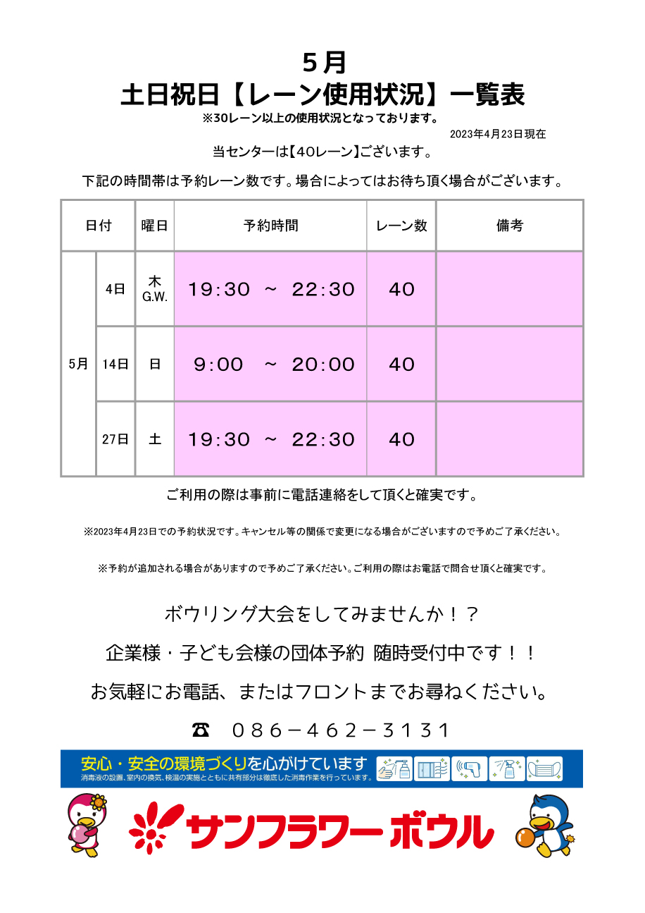 2023年5月中の土日祝日のレーン使用状況一覧表