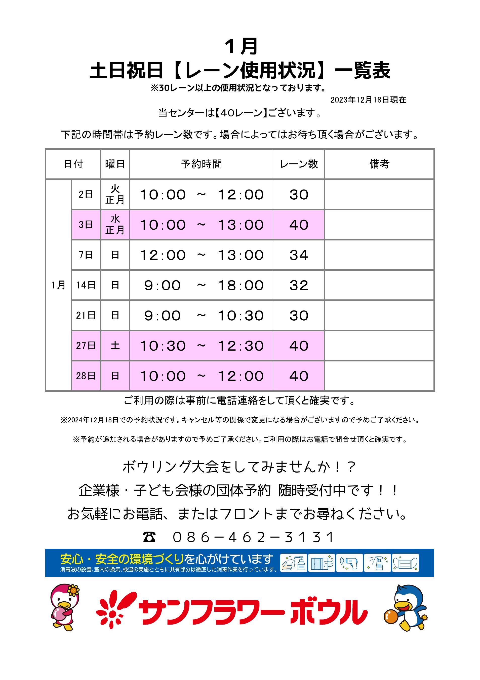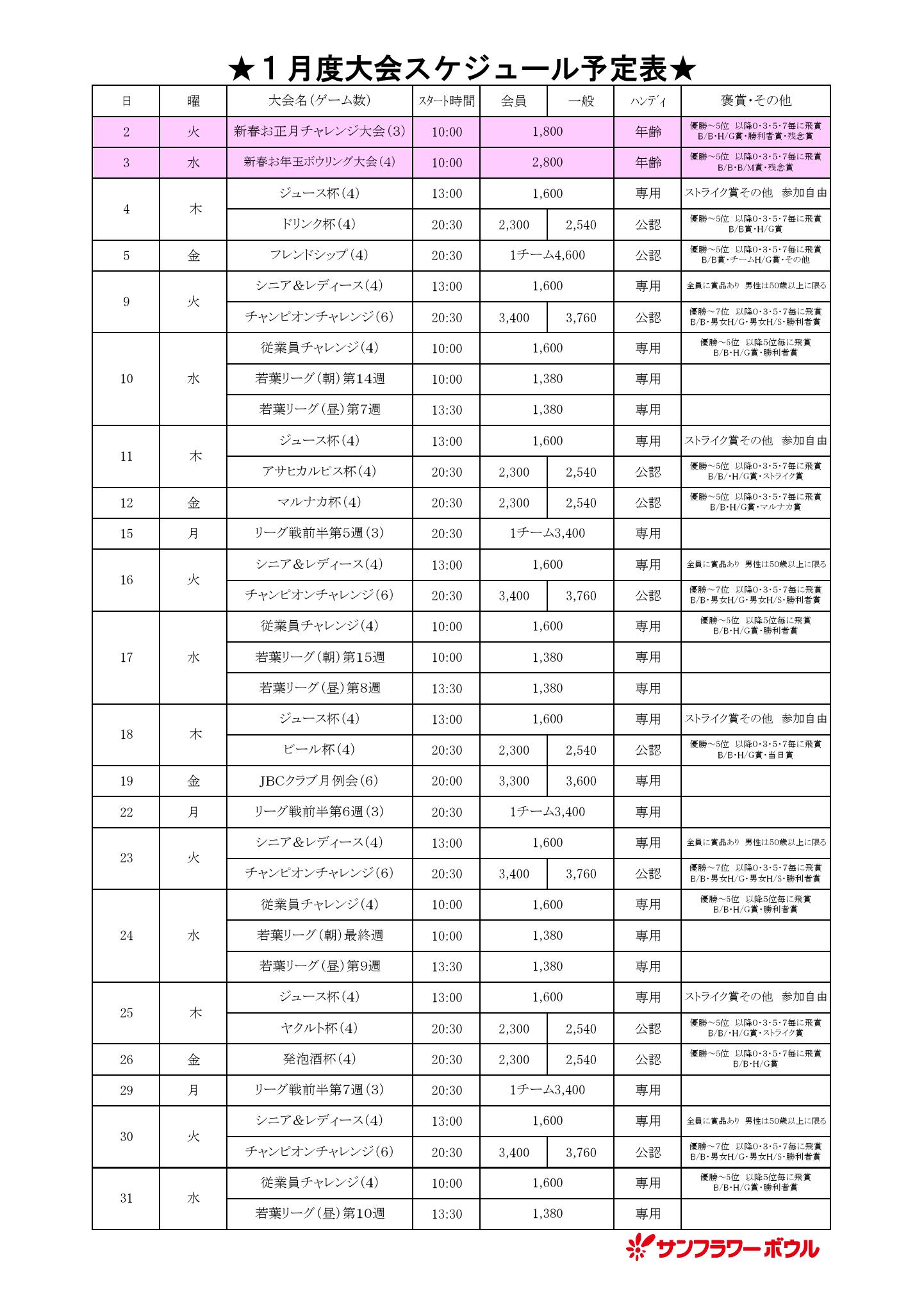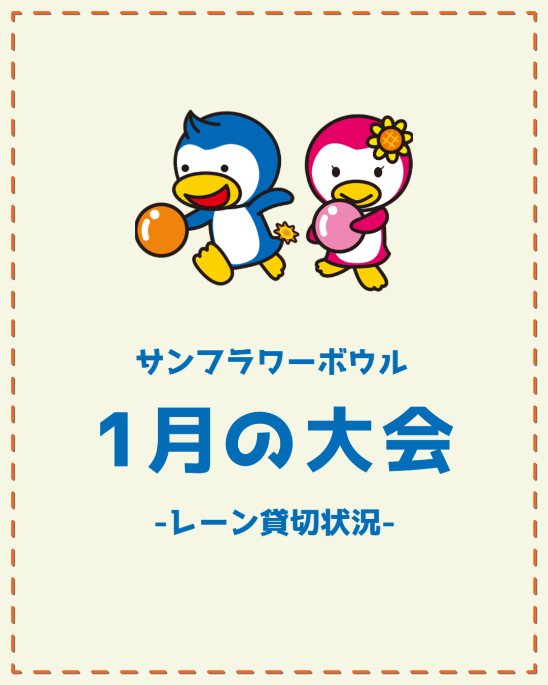 サンフラーボウルの2024年1月度の大会、レーン貸し切り状況一覧です。